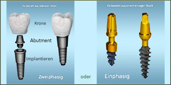 Die orale Rehabilitation mit einphasigen Implantaten besteht aus zwei Phasen. In der ersten Phase erfolgen die Implantation der sofort belastbaren Implantate und die Anfertigung des langlebigen provisorischen Zahnersatzes. In der zweiten Phase wird der endgültige Zahnersatz angefertigt.